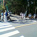 | 5月2日、毎朝出発前のラジオ体操でからだをほぐし、妙義山麓をあとに軽井沢へ、碓氷峠の頂上で長野県へ入り、ここでお世話になった群馬拠点「やまびこ」の皆様ともお別れです。軽井沢では皇后陛下がプレーされるテニスコートなどを通り、全員元気に歩いています。 |